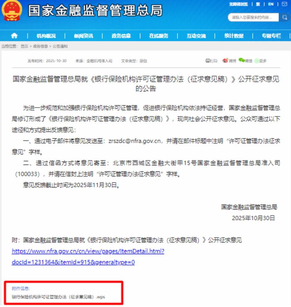 2025年10月30日,国家金融监督管理总局发布《银行保险机构许可证管理办法(征求意见稿)》,向社会公开征求意见。此次修订旨在加强银行保险机构许可证管理,落实金融特许经营和持证经营原则,既优化管理流程,又压实机构主体责任,强化监管执法。本办法所称许可证包括下列几种类型:(一)金融许可证;(二)保险许可证;(三)保险中介许可证。实行分级管理。