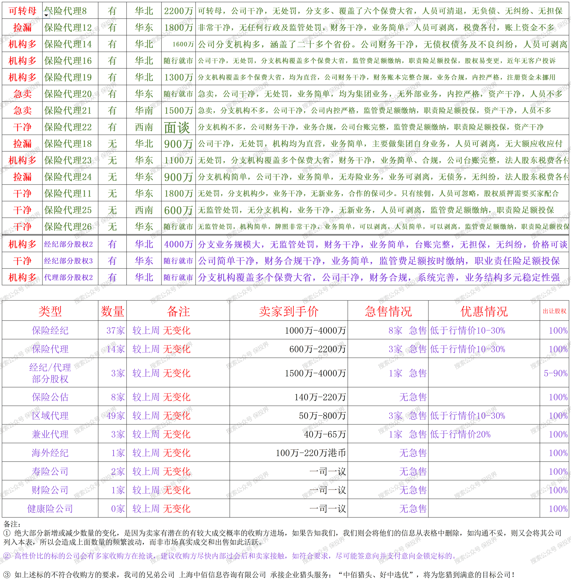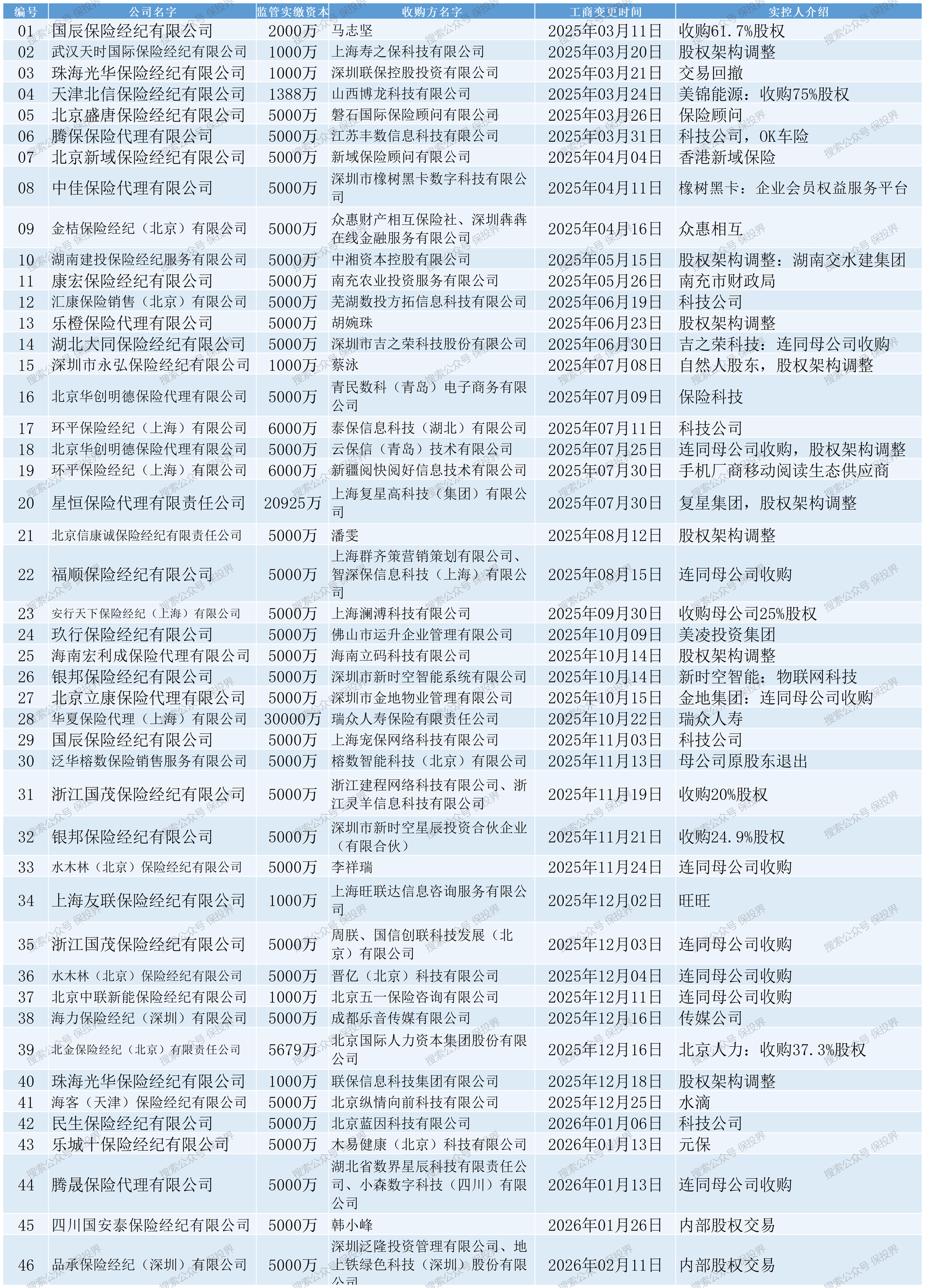 保险中介公司股权交易资讯,2026年2月24日第9周: 上周工商变更:(成交热度 200) 经纪成交1家,代理无成交,公估未统计,区域代理未统计 上周挂牌情况: 经纪无变化,代理无变化,公估无变化,区域代理无变化 全国性保险经代公司成交汇总(含内部股权调整): 2015年19家;2016年49家;2017年77家; 2018年75家;2019年64家;2020年51家; 2021年50家;2022年47家;2023年48家; 2024年53家;2025年47家;2026年5家。 最近成交 1 1