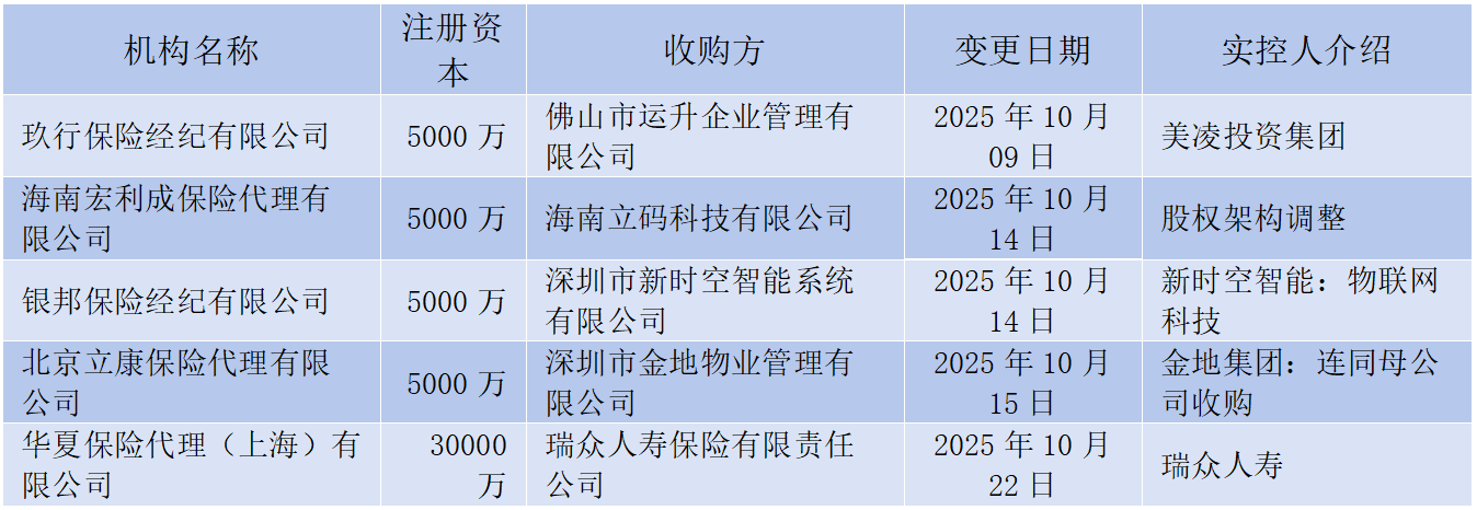 10月份,共有5家保险中介公司完成股权调整,收购方背景多元,涵盖科技企业、房地产集团乃至保险公司自身,资本对合规、有网络价值的中介机构依然看好。