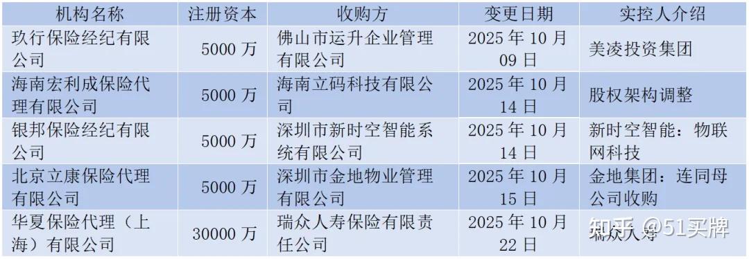 10月份,共有5家保险中介公司完成股权调整,收购方背景多元,涵盖科技企业、房地产集团乃至保险公司自身,资本对合规、有网络价值的中介机构依然看好。