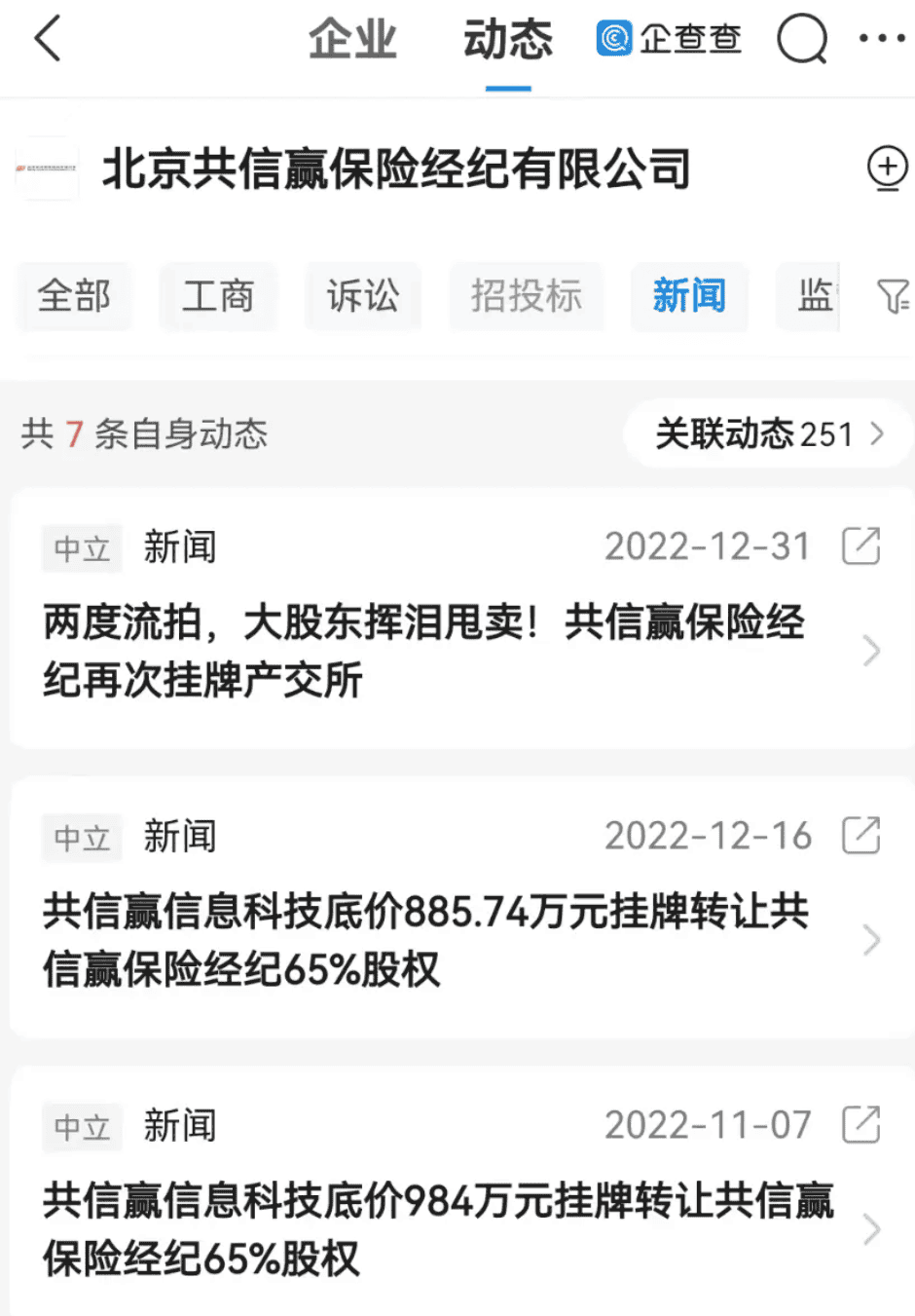 北京共信赢保险经纪有限公司的遭遇,是低价牌照风险的典型例子,在2022年3月到2023年1月期间,这家公司65%的股权连续拍卖了七次,一次都没成交,第一次挂牌价是1500万元,经过6次流拍后,第七次降到885.74万元,价格差不多砍了一半,却还是没人感兴趣, 2025年12月,这家公司的许可证因为工商吊销就被注销了。