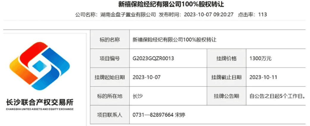 2023年10月,这家公司百分百的股权在长沙联合产权交易所挂牌转让,挂牌价格是1300万元, 交易保证金400万元,挂牌期就只有5个工作日,经过调查发现,新禧保险经纪存在经营债务、股权被查封冻结、涉及服务纠纷和劳动纠纷等很多问题。它挂牌拍卖的根本原因是股东资金链断了,为了还债而忍痛割舍。